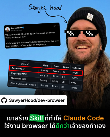 รีวิวการใช้งาน dev-browser skill สำหรับ Claude Code ที่ช่วยให้ AI agent ควบคุม browser ได้เร็วกว่า Chrome integration ของ Claude เองถึง 2 เท่า พร้อมอธิบายเทคนิค ARIA Snapshot และ Ref system ที่ทำให้ทำงานได้มีประสิทธิภาพ